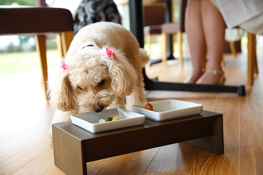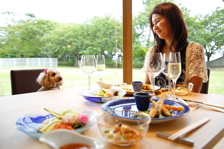 愛犬と一緒に食事ができるダイニングレストラン。明るく開放感あふれる空間で、ペット用のカートもご用意していますので、ゆったりとスペースをとってお客様も愛犬も気兼ねなく食事を楽しんでいただけます。