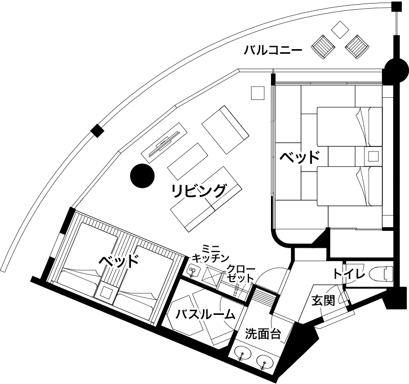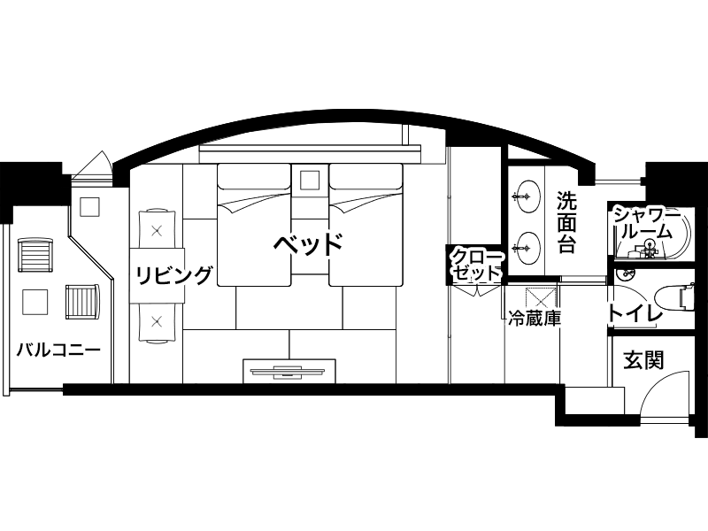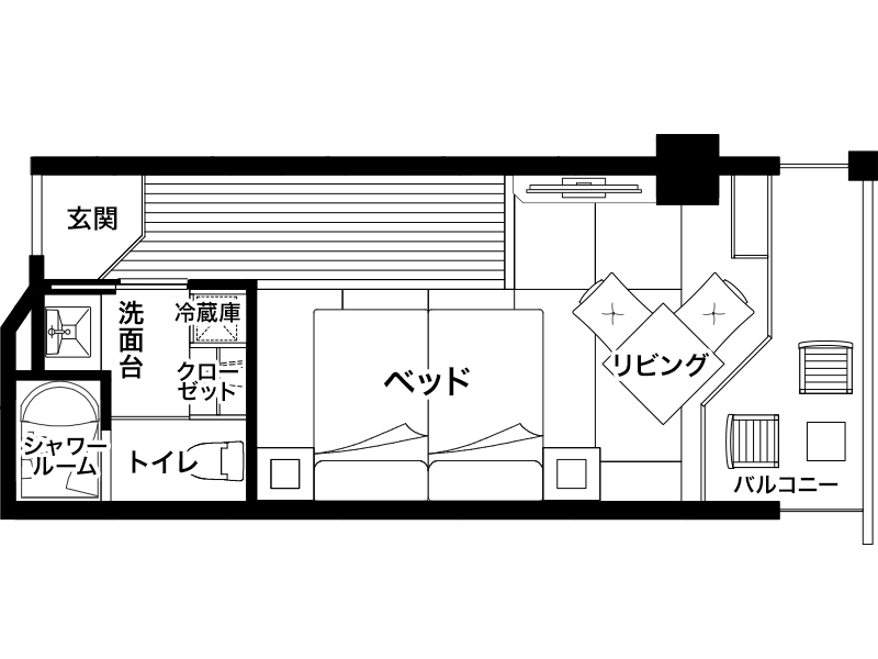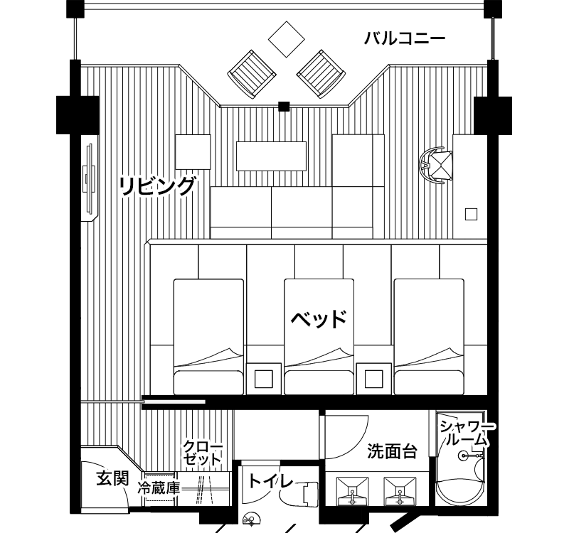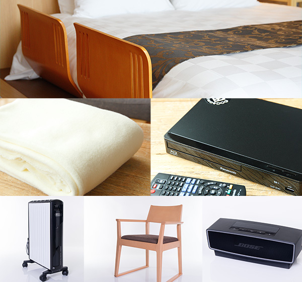 ひとつ上の旅を満喫していただくために、インテリアはもちろんのこと、ベッド(シモンズ社製/ハリウッドツイン)や、