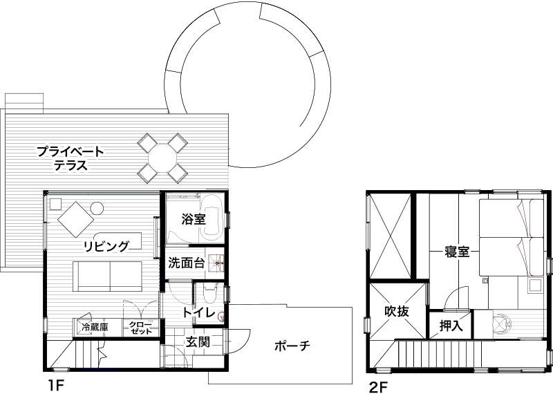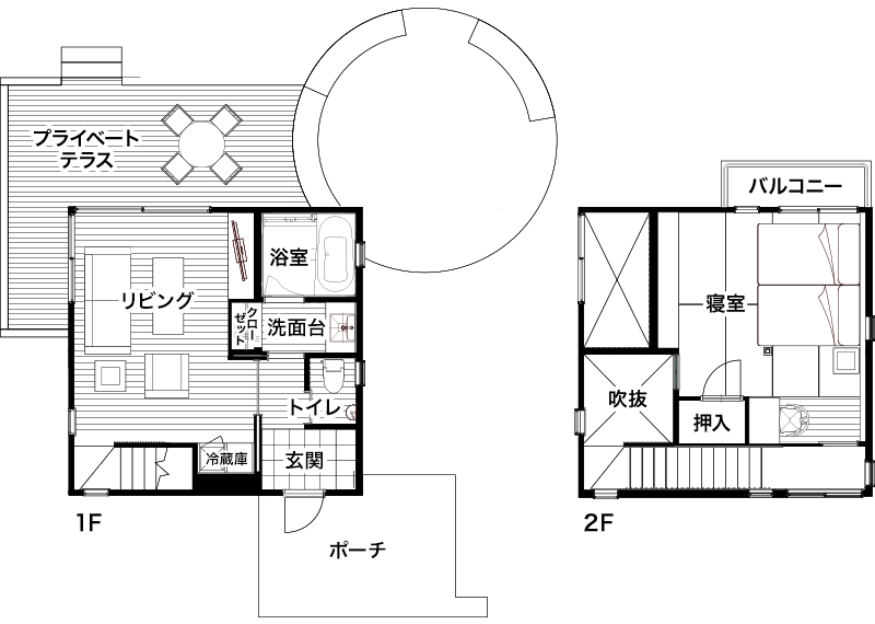 本館を離れた湖岸近くに佇むプライベートコテージ。1階には、ご家族揃ってゆっくりくつろげるリビングと、15㎡の屋外テラス。