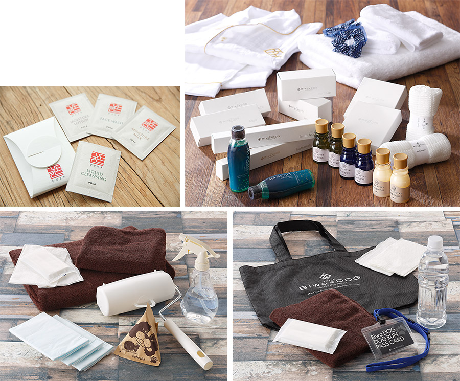 ビワドッグでは、お客様だけでなく、大切な愛犬も快適にお過ごしいただけるように、 客室やホテル内の各スペースに、充実したアメニティをご用意しています(写真上段)。 レセプション(フロント)でも受付スタッフが対応いたしますので、お気軽にお声がけください。