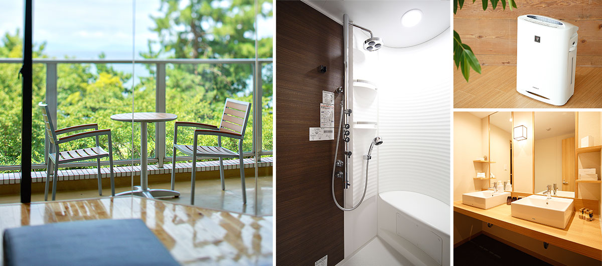 本館全10室に琵琶湖を一望できるバルコニーを完備。コテージには16㎡の広さのプライベートテラスをご用意。